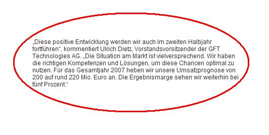 Ulrich Dietz rechnet im Jahr 2007 für den GFT Konzern mit einer operativen Marge von 4,5 bis 5 Prozent vor Steuern (2006: 3,8%). Das Ergebnis je Aktie werde auf 0,24 bis 0,26 Euro ansteigen.