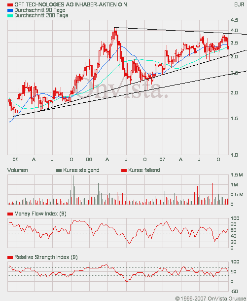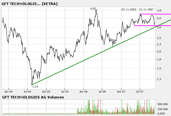 Lichtenstein (aktiencheck.de AG) - Die Experten von "TradeCentre.de" empfehlen weiterhin die GFT Technologies-Aktie (ISIN DE0005800601/ WKN 580060) zu kaufen. Der im Schwarzwald ansässige IT-Dienstleister sei auf dem besten Wege ein ausgezeichnetes Jahr zu absolvieren. Das Unternehmen habe im Laufe des Jahres bereits mehrfach die Prognose erhöhen können und sei nun auf der Zielgeraden diese auch zu erfüllen. Das sage den Experten Finanzvorstand Jochen Ruetz bei ihrem Treffen anlässlich der Münchener Kapitalmarktkonferenz der GBC AG. Nach neun Monaten habe der Umsatz knapp 177 Millionen Euro und das EBT 8,7 Millionen Euro erreicht. Netto habe in der Kasse ein Gewinn von 5,7 Millionen Euro oder 22 Cent je Aktie geklingelt. Das dritte Quartal sei mit einer EBIT-Marge von über fünf Prozent und einem Gewinn je Aktie von neun Cent super ausgefallen. "Das vierte Quartal wird aufgrund weniger Arbeitstage nicht ganz so stark ausfallen wie das Q3. Dies ist aber entsprechend unserer Planung berücksichtigt", erkläre Ruetz. Der Finanzvorstand rechne für das Gesamtjahr nunmehr mit einem Umsatz von 230 Millionen Euro und einer EBIT-Marge von fünf Prozent. Vor Steuern entspreche dies einem Gewinn von 11,5 Millionen Euro. Die Steuerquote beziffere der CFO auf circa 30 Prozent. Netto sollten sodann bis Silvester acht Millionen Euro verdient werden oder 30 Cent je Aktie. Für das Jahr 2007 wolle das Unternehmen auch eine Dividende auszahlen. "Wir können uns vorstellen, dass wir etwa ein Drittel unseres Jahresgewinns ausschütten", sage Ruetz. Entsprechend sei eine Dividende von circa zehn Eurocent je Aktie zu erwarten. Das würde bei einem Kurs von 3,20 Euro einer Rendite von drei Prozent entsprechen, was sehr ordentlich sei. Operativ profitiere GFT Technologies von einer guten Konjunktur und einer regen Nachfrage der Kunden. Das Unternehmen mache allerdings einen Umsatz von circa 80 Millionen Euro mit Banken. Bekanntlich würden Banken derzeit massiv Geld durch den Schornstein jagen, als ob es Papiergeld sei. Drohe von dieser Seite aus eine Investitionszurückhaltung, könnte dies GFT Technologies eventuell negativ treffen. "Bisher spüren wir diesen Effekt nicht. Auf das Investmentbanking entfallen lediglich rund 21 Millionen Euro Umsatz im Bereich Services. Gerade dieser Bereich ist von der momentanen Krise der Banken am stärksten betroffen", erläutere Ruetz. Ob der Schlammassel auf GFT Technologies schlussendlich übergreifen könnte, sei offen. Ruetz sei aber zuversichtlich, dass sich dies im Rahmen halten werde und vermutlich kompensiert werden könnte. Im nächsten Jahr strebe das Unternehmen erneut organisches Wachstum an. "Wir wollen pro Jahr im Schnitt um 15 Prozent wachsen, um im Jahr 2011 einen Umsatz von 350 Millionen Euro zu erreichen". Das Jahr 2007 sei ein überdurchschnittliches Jahr gewesen. Möglich, dass GFT Technologies in 2008 zwischen 10 und 15 Prozent wachse und sich das Wachstum zu 2007 etwas abschwäche. Laut Ruetz solle sich hingegen die EBIT-Marge im nächsten Jahr weiter verbessern und sich mittelfristig auf circa acht Prozent belaufen. Das Wachstum könnte sich aber auch durch Zukäufe weiter beschleunigen. "Wir schauen uns im Markt nach Übernahmen um und prüfen permanent externes Wachstum", sage Ruetz. Gut möglich, dass der Vorstand im Jahr 2008 erneut zuschlage und sich eine Firma in Deutschland, der Schweiz oder Frankreich einverleibe. Mit einem KGV von zehn für das Jahr 2007 sei die Aktie zu günstig. Für 2008 werde sich das Gewinn-Multiple sogar in den einstelligen Bereich reduzieren. Die Experten von "TradeCentre.de" halten an ihrer Kaufempfehlung für die Aktie von GFT Technologies fest. (Analyse vom 14.01.2008) (14.01.2008/ac/a/nw)