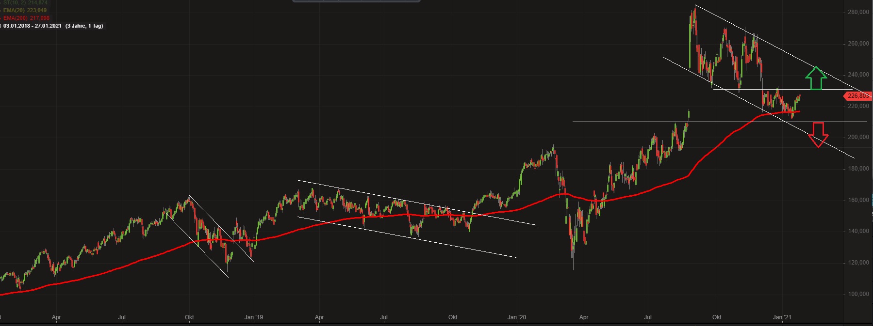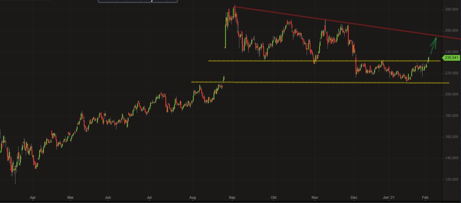 Hoffentlich kommt jetzt endlich die Befreiung. Immer bei 230 USD ging es schnell runter. Wenn wir heute mal 3% machen würden, dann hätten wir endlich mal die Marke überwunden.