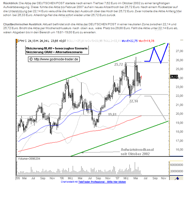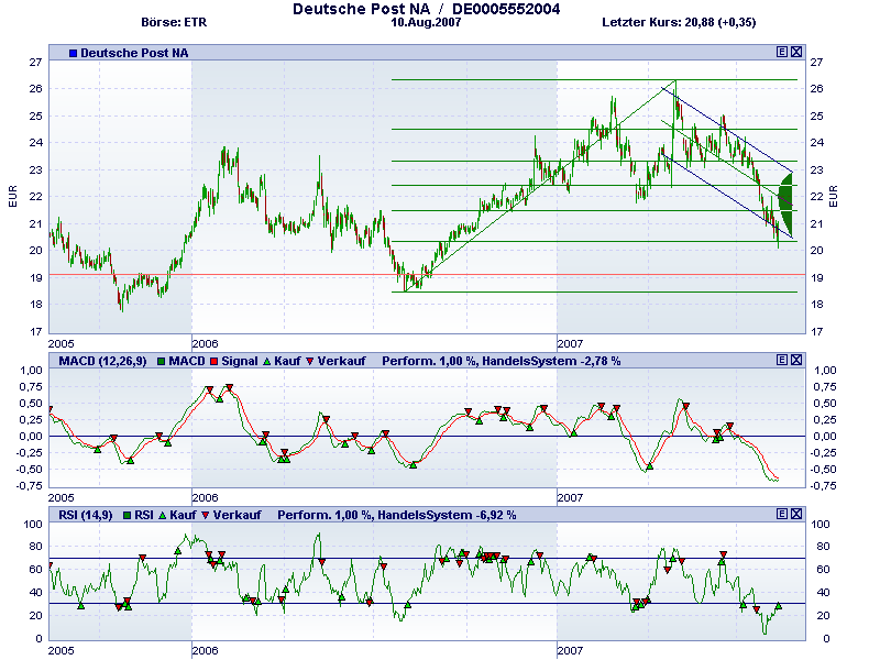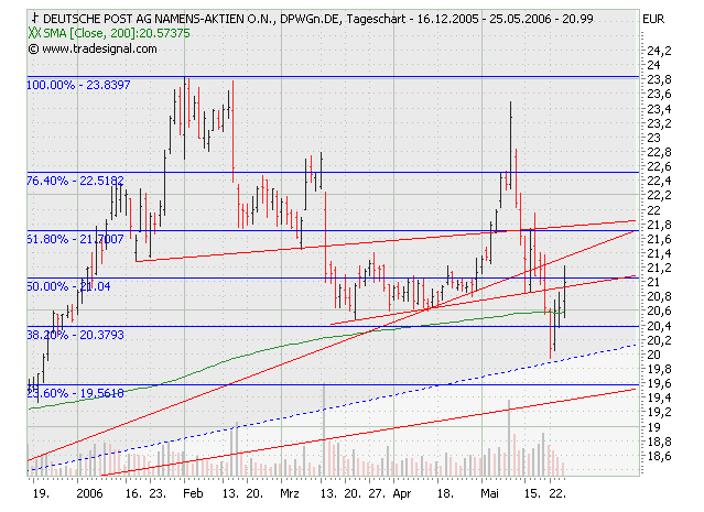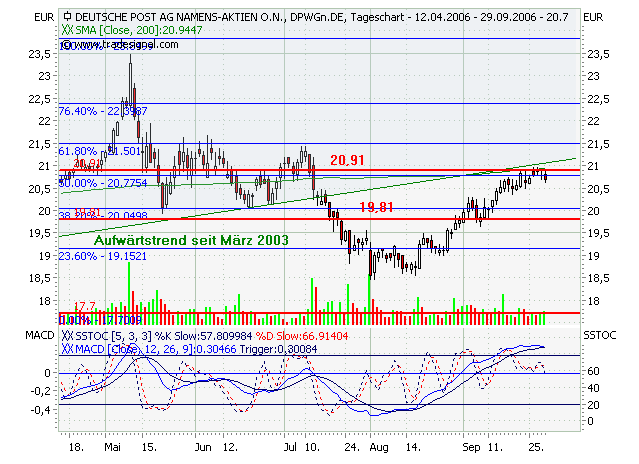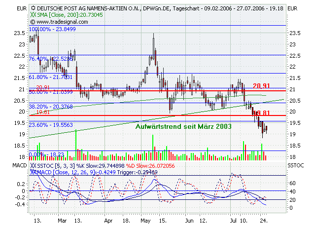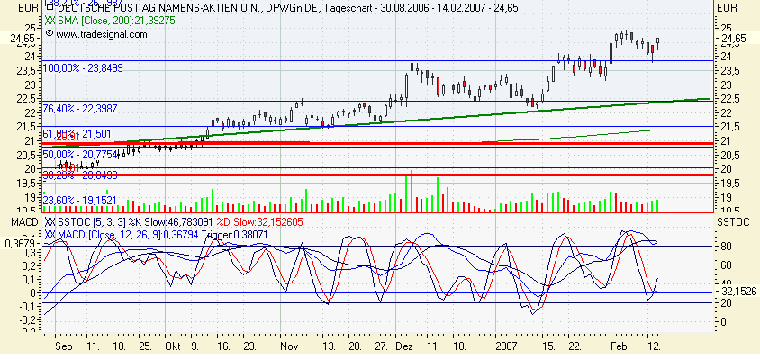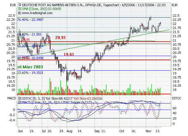Die Deutsche Post AG strebt in ihrem Expressbereich langfristig eine deutlich höhere Rendite an als derzeit. Nach 2009 sei eine EBIT-Marge von 10% geplant, sagte Express-Finanzvorstand Oliver Gritz am Dienstag auf einer im Internet übertragenen Analystenkonferenz in New York. In den ersten neun Monaten dieses Jahre betrug das Verhältnis vom Umsatz zum Ergebnis vor Zinsen und Steuern erst 0,7%. Der gesamte Expressbereich ist durch hohe Verluste im US-Geschäft in Mitleidenschaft gezogen.Die Deutsche Post Aktie bewegte sich in einem langfristigen intakten Aufwärtstrendkanal. Aus diesem ist sie signifikant nach unten ausgebrochen, jedoch im weiteren Verlauf (am 21.09.2006) erneut in den Aufwärtstrendkanal eingetreten. Dadurch hat sich das Chartbild wieder verbessert, denn es besteht nun die Hoffnung, dass die Deutsche Post Aktie Ihren langfristigen Aufwärtstrend fortsetzt. Erst bei einem weiteren signifikanten Ausbruch aus dem Aufwärtstrendkanal würde sich das Chartbild erneut verschlechtern. Die Kursentwicklung bestätigt somit wieder den bisher aussichtsreichen Chartverlauf. Aus diesem Grund können die Aktien-Positionen wieder unter Beachtung der Indikatorenanalyse aufgebaut werden.