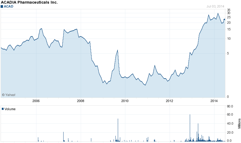 Ja,hm ! Prana ist aber nicht grundlos ab gestürzt wie DARA,sondern das hat nicht geklappt mit dem alzheimer dingens,willst du etwa einsteigen ? Alzheimer und Parkinson Medis haben es enorm schwer die clinicals zu bestehen,das ist das Problem,aber ein Fall ,wo es hervorragend geklappt hat ist Acadia,deren Parkinson dingens ist erst durchgefallen und hat im 2.Versuch dann top-line Resulte geliefert,sehr mysteriös find ich das ! Die aktie erst auf 30 Cent runter in 2009 und heute nach der Zulassung bei 30 dollar: