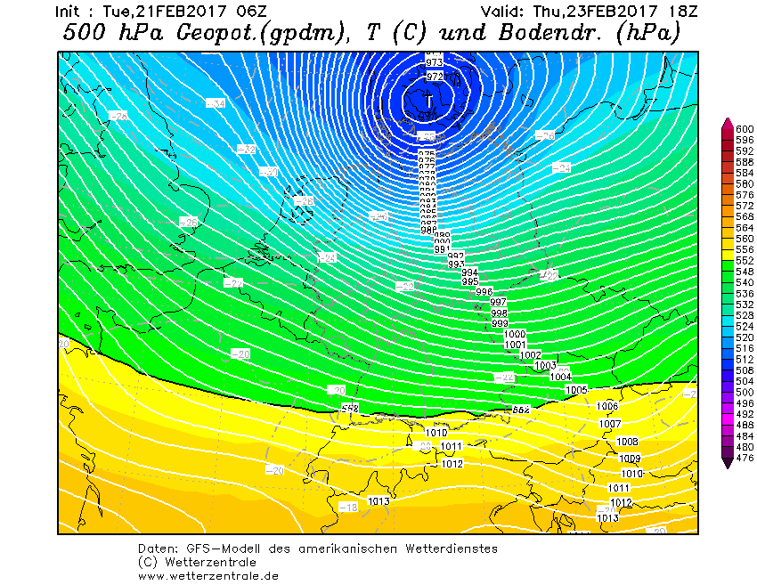 Am Donnerstag (Weiberfastnacht) entwickelt sich über den britischen Inseln ein sehr wetteraktives Orkantief, das als Schnellläufer über Deutschland hinwegzieht. Die höchsten Windgeschwindigkeiten werden dabei am Vormittag im Bereich Münsterland, nördliches NRW und Ostfriesland erwartet, etwa 90 bis 120 km/h, mittags dann über Niedersachsen, Hessen, Sachsen-Anhalt und abends dann im Bereich Berlin-Brandenburg und MecPom.