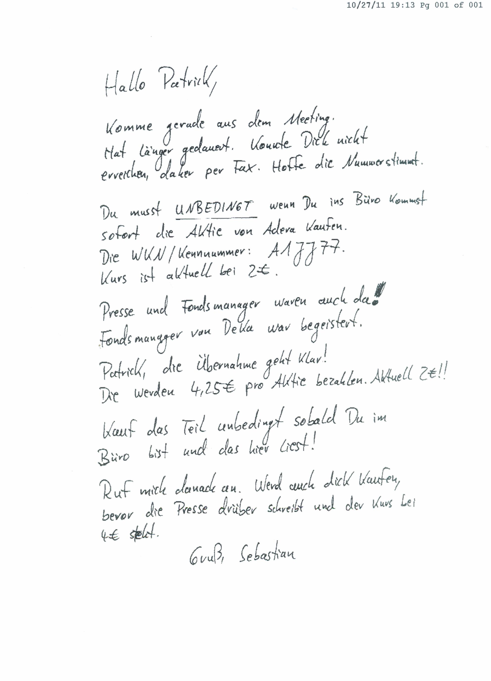 wer heutzutage immer noch ein Fax für (WKN) - Angebote unseriöser Art nutzt, stammt aus der vor _"gestrigen" Zeit, ist entweder ein Zigarrenraucher oder hat noch nicht verstanden, was für Strolche am Markt präsent sind. Das sind anonyme Hütchenspieler, die auf den einen "Bauern" warten und offenbar gibt es immer wieder Neue, die auf alte Maschen reinfallen