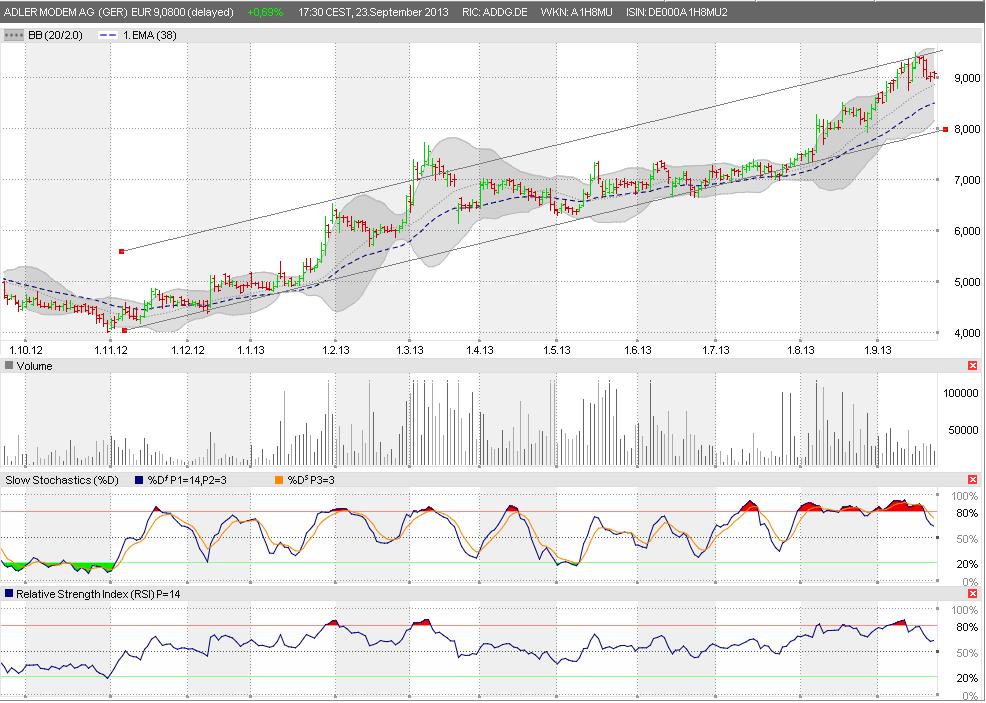 scheint es hier nicht mehr zu geben. Auffällig finde ich zum einen, dass trotz der guten Performance der vergangenen Monate kaum Aktien einfach blind in den Markt geworfen werden um Gewinne mitzunehmen. Zum anderen gibt es offenbar doch ein paar stärkere Hände, welche dann auch mal Pakete von 10.000 Stück zum aktuellen Kurs von etwa 9,60€ kaufen. Das sind jetzt zwar keine Unsummen an der Börse, aber bei einem relativ kleinen und illiquiden Wert wie ADD geht der Käufer wohl davon aus, dass die Zahlen am 7. Nov. entsprechend positiv ausfallen. Sollte dem so sein, dann kann es über die 10€ gehen.