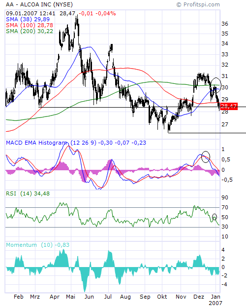 Es geht weiter darum, dass die relative Schwäche der Aktie gegenüber anderen Metallwerten seit 2001 vorerst vorbei sein könnte. Schon seit den Q3-Zahlen hat Alcoa etwa den Stoxx Basic Resources deutlich überflügelt. Und es spricht viel dafür, dass die Preise auf dem relativ ausgeglichenen Markt für Aluminium bei der sich abzeichnenden weiteren Mäßigung der globalen Industriekonjunktur weniger unter die Räder kommen als etwa jene auf den überhitzten Märkten für Kupfer oder Nickel. Bei einem KGV von 10 ist man bei Alcoa da wenigstens relativ gut aufgehoben.