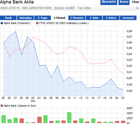 In Griechenland wird ab 01.01.2014 der Aktiengewinn versteuert. Kein Wunder, dass jetzt alle die noch Gewinne erzielt haben, dieses Jahr verkaufen. Außerdem war in Dezember auch der erste Termin der Optionsscheine fällig... was soll da noch steigen?