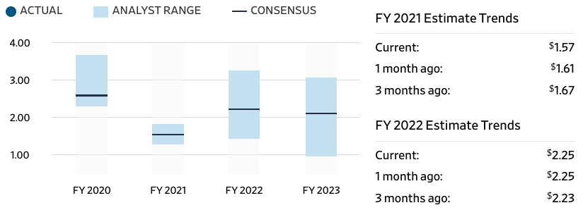 ... wird u.a. einem produktionsrückgang aufgrund des verkaufs der südafrikanischen betriebe zugeschrieben; der gesamtgewinn pro aktie dürfte 2021 um 42% zurückgegangen sein und zwischen 1,37 $ (21 R) und 1,53 $ liegen; börse blickt jedoch in die zukunft: 2022 soll der gewinn/aktie auf 2,69 $ steigen (6 analysten)