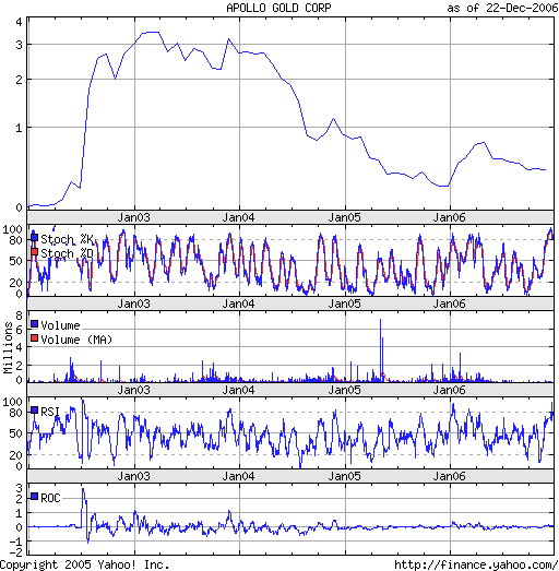 Aber bei Apollo gefällt mir, dass sie innerhalb eines Trendkanals relative wenig Volatilität zeigt. Und es ist ein Produzent, zwar noch nicht rentabel, aber du kannst dir ja überlegen, wie das Ergebnis aussähe, wenn der Goldpreis 10-20 % steigt. Zudem sind die Modernisierungsmaßnahmen der Mine(n) großteils 2006 abgeschlossen, d.h. das Ergebniss sollte ohnehin deutlich besser werden.