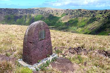 Ein weiters Bild von der Stelle, an der Gedenkstein auf dem Kraterrand des Vulkans Rano Kao steht, findet man hier: