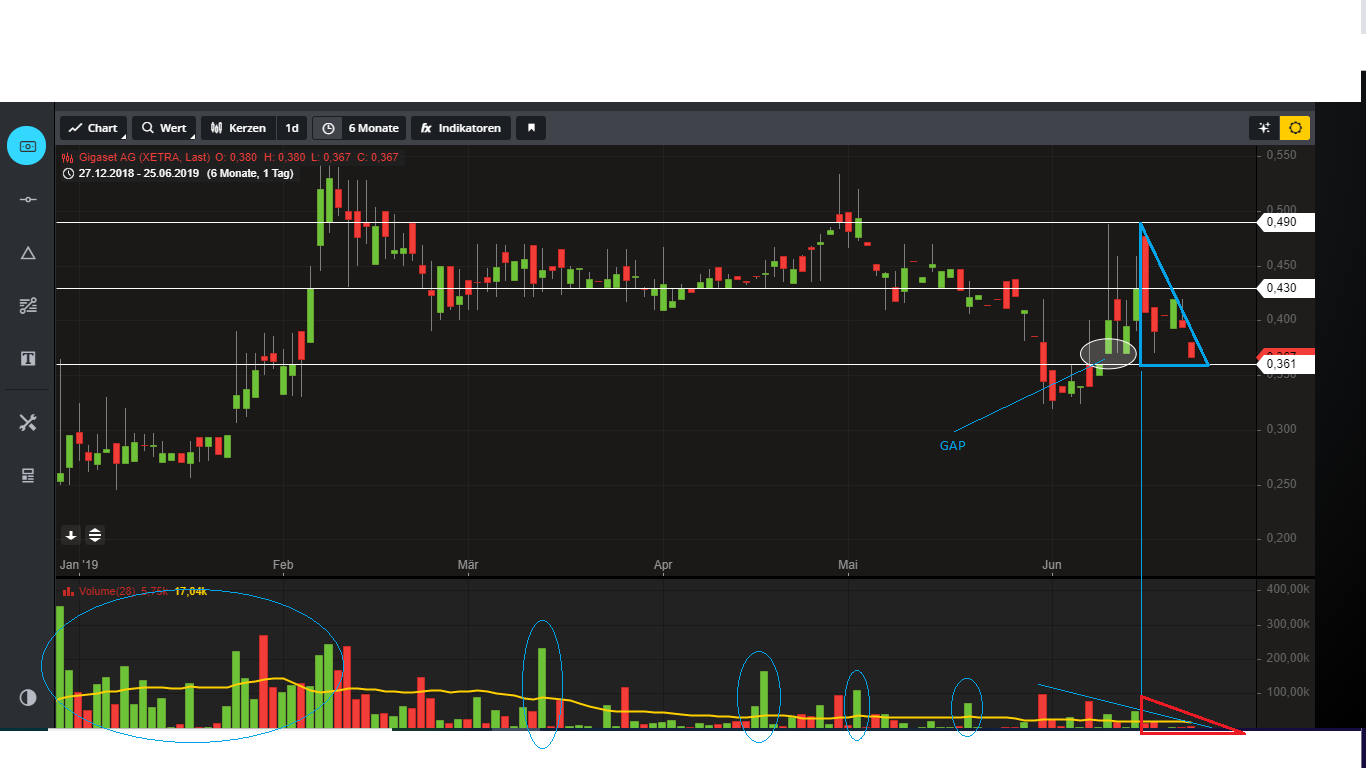 Volumen unten betrachten, es ging mit minimalen Umsätzen fast 30% nach unten, aber technisch betrachtet musste es sein um das GAP zu schließen. Genau so gut wird es nun mit kleinen Umsätzen nach oben gehen können, erst ab 43 Cent dürften die Umsätze wieder ansteigen und man muss sich dort stabilisieren.