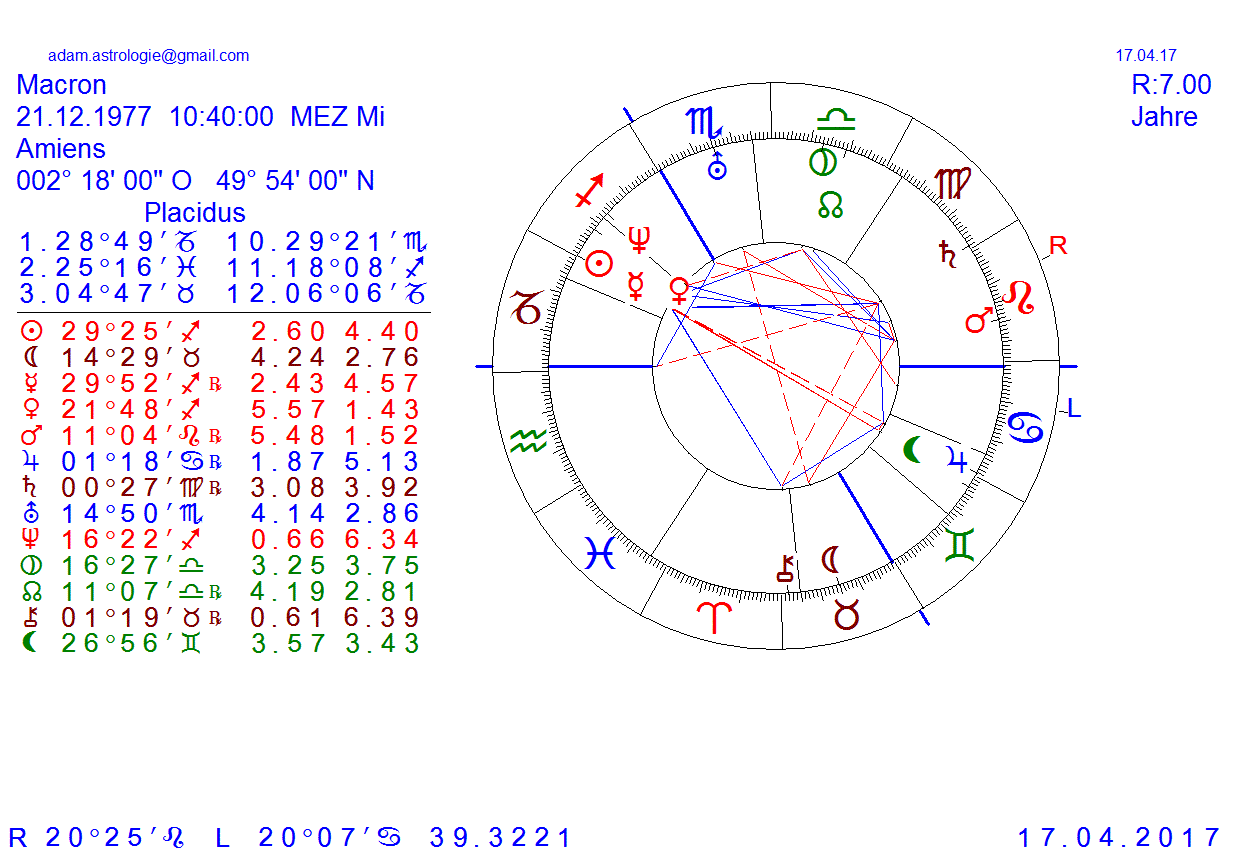 eigentlich ist lt radix er selbst ein revolutionär, denn man dann von seiten der eliten frühzeitig erkannt hat und für eigene zwecke einfing, labil genug dazu ist er(Achse Schü zu Zwill) sich führen bzw.verführen zu lassen und zwar etwas zu tun, was eine nummer zu groß für ihn ist und was platzen wird wie ein ballon der zuweit emporgestiegen ist, aus falscheinschätzung seiner selbst und den eigenen qualitäten, der zauberlehrling als chef kann und wird nicht gut gehen, denke ich, ein richtiger banker ist er auch nicht, eher ein pleitist und visionär der aber nicht imstande ist seine visionen letztlich auch politisch durchzusetzen und am ende als versager die bühne verlässt, das mag gut und gerne eine ganze regierungsperiode andauern, eben solange bis man ihn fallen lassen muss und er noch von der zerstrittenheit seiner auftraggeber und deren eigener probleme noch profitiert und über wasser gehalten wird, bis eine neuer plan erstellt und ersichtlich sein wird. JU transiert seine Schü Pla, aber selbst der offenbart seinen grössenwahnsinn, denn sein radix zeigt nur eine marionette und mit MEr sowie SO in Opp zu JU wo beide R sind und im falschen neg Zeichen zeigt, dass er mehr verspricht als er halten kann und dass er letzlich auch aus dem Amt verjagt werden kann, sobald die Sterne seine Quadr zu der Achse MO Sti opp UR Sko und Quadr MA Löw, auslösen, also wird er auch schon im März 2018, mit MA tr über seinen MO, verstärkt Probleme mit dem eigenen Volk bekommen und um seine Bastion zu halten, den die Prodeste gegen ihn werden weiter gehen, solange bis er ko geht.