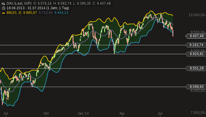 (95% aller Aktienkurse verlaufen innerhalb des GD20 Bollinger Bandes)