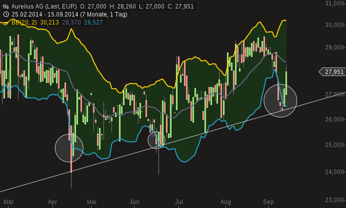 für eher unerwartete überraschungen sorgte - charttechnisch ist alles im reinen. exakt an der steigenden trendlinie nach oben abgeprallt, oder anders: jedes mal wenn der kurs aus dem unteren bollinger rutscht gibt es einen baldigen rebound. das konnte man jetzt mehrmals schon feststellen.