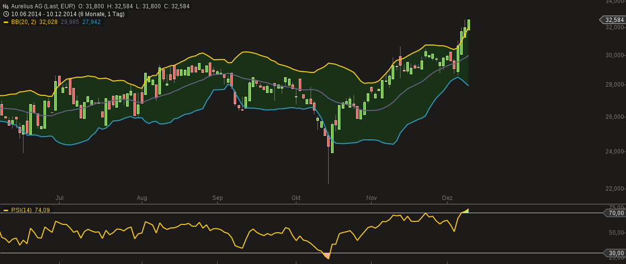 und meine wie eure freude trüben, aber das geht mmn momentan etwas zu schnell und aus ct sicht würde ich für die nächsten tage nicht von weiter steigenden kursen ausgehen. nachdem das alte ath jetzt schon zum dritten mal hintereinander getoppt wurde, und der kurs aus dem obb raus ist, sowie rsi überkauft anzeigt, rechne ich diese woche mit einem kleinen rücksetzer unter 31 - nicht die welt, aber es sollte niemanden überraschen, wenn die aktie auch mal wieder 5 % verliert.