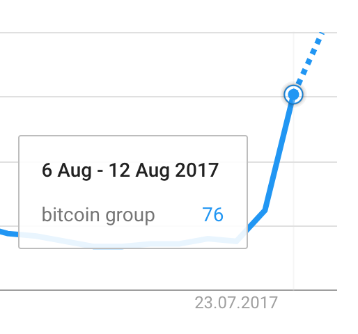 Man betrachte mal die Entwicklung der bitcoin group auf google trends. Diese ist so hoch wie nie zuvor. Das erklärt zum Einen den rasanten Kursanstieg, begründet zum Anderen den weiteren positiven Verlauf. Denn bis zum 19.08 prophezeit google eine Interessens Steigerung um ca. 24 %. Das würde den Kurs weiter pushen. Denn mit Sicherheit werden einige dieser Interessenten auch einsteigen wollen.