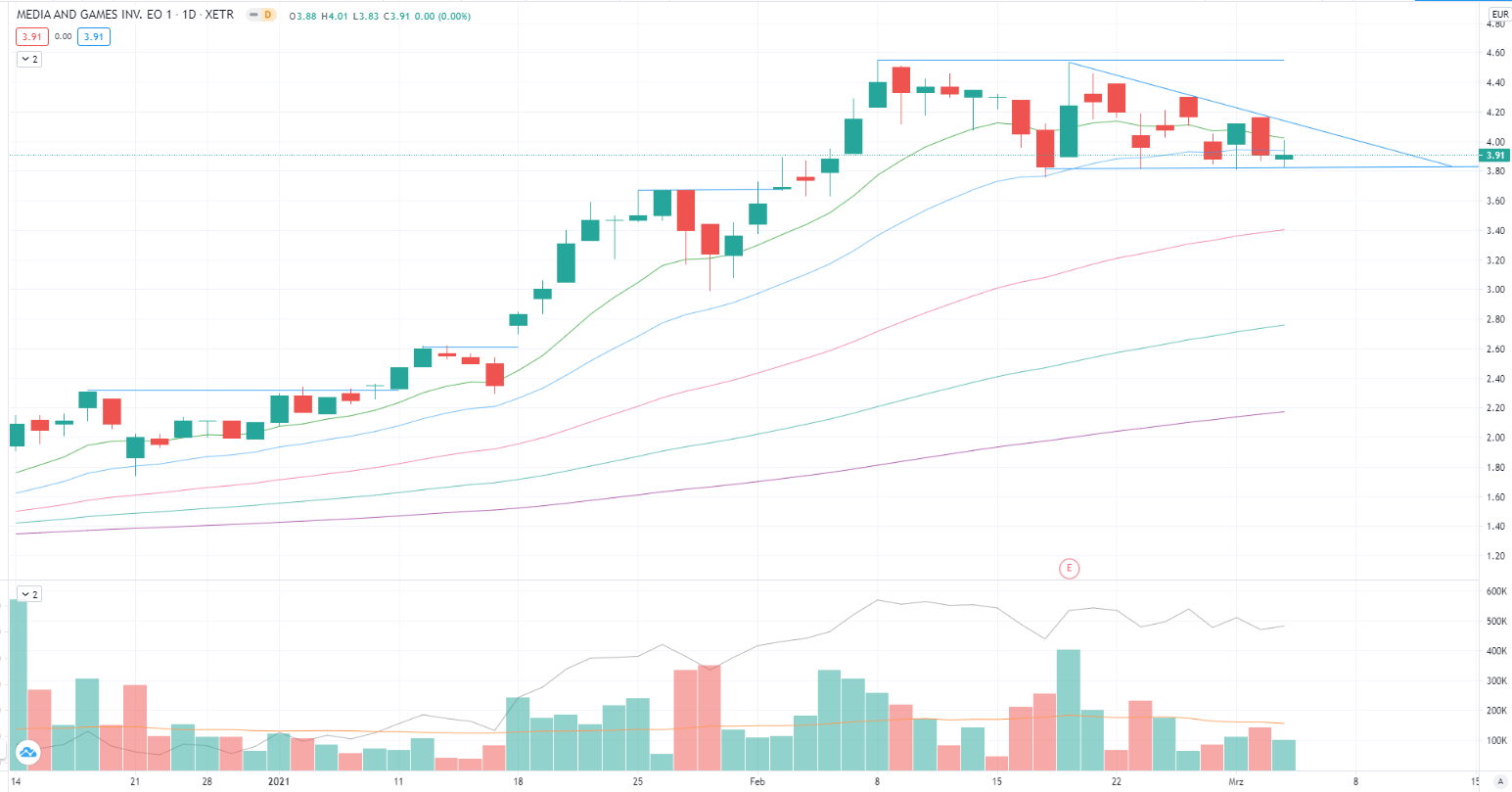 Die graue Linie unten zeigt die relative Stärke im Vergleich zum S&P 500 an, das ist für mich immer Richtungsweisend und sieht bei M8G sehr gut aus, da es seit 4 Wochen das Level hält, während viele andere Gaming-Aktie deutlich abgerutscht sind.
