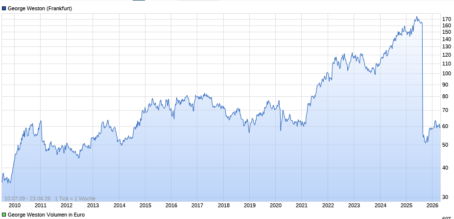 George Weston hat 2025 einen 3-zu-1-Aktiensplit durchgeführt. Beschlossen wurde er Ende Juli 2025; wirksam war er zum Börsenschluss am 18.08.2025. Aktionäre bekamen für jede gehaltene Aktie zwei zusätzliche Aktien. Deshalb sieht der Kurs seitdem optisch etwa nur noch wie ein Drittel des früheren Niveaus aus. (Weston)