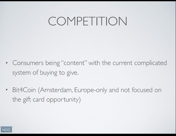 In der bereits zitierten Präsentation der NGG Inc., die im Rahmen der HV 2018 gehalten wurde, findet sich m.E. ein weiterer Hinweis, dass man perspektivisch auch außerhalb Europas tätig sein möchte. Als Wettbewerber hat man die niederländische Firma Bit4Coin aufgeführt, die allerdings "nur auf Europa ausgerichtet ist."