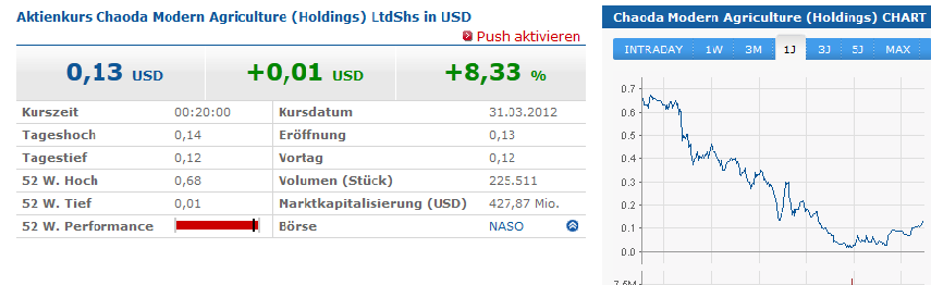 Chaoda Modern Agriculture hat nach eigenen Angaben zufolge Wandelanleihen in Höhe von 195,4 Millionen US - Dollar zurückgezahlt ! Bisher wurde vermutet, dass Chaoda das nicht stemmen kann, wäre es dazu gekommen wäre das Vertauen dahin und käme einen Totalverlust gleich, daraufhin hatte hatte S&P Anfang dieser Woche das Rating von "CCC" auf "CC" mit negativem Ausblick gesenkt ! Nach Bekanntgabe der Zurückzahlung der Wandelanleihen hat S&P seine negative Wertung am 16.02. zurückgezogen !!! Das lässt hoffen und bergründet den rasanten Kursanstieg an der US Börse. Nun müssen wir abwarten, wie es sich weiterentwickelt. Chaoda hat am 16.02. bekundet über genügend liquide Mittel zu verfügen. Vielleicht kommen wir mit einem blauem Auge davon, das in der nächsten Zeit auch noch ausheilt, wäre ja für alle Investierten wünschenswert.