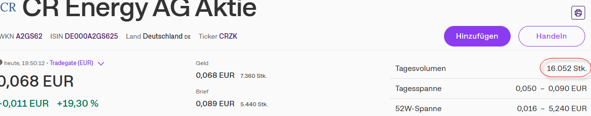 CR Energy Aktie: 0,21 EUR +0,117 EUR +125,81 %, 16:14:33