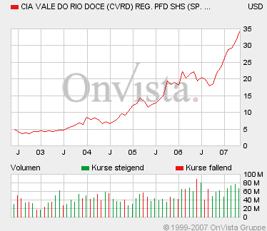 Die CVRD-Aktie erreichte gestern im amerikanischen Handel ein neues All-Time-High bei 44,99$. Die Dividendenausschüttung und der Rohstoffboom geben anscheinend weitere Impulse.