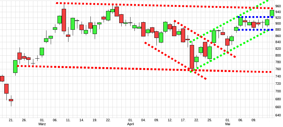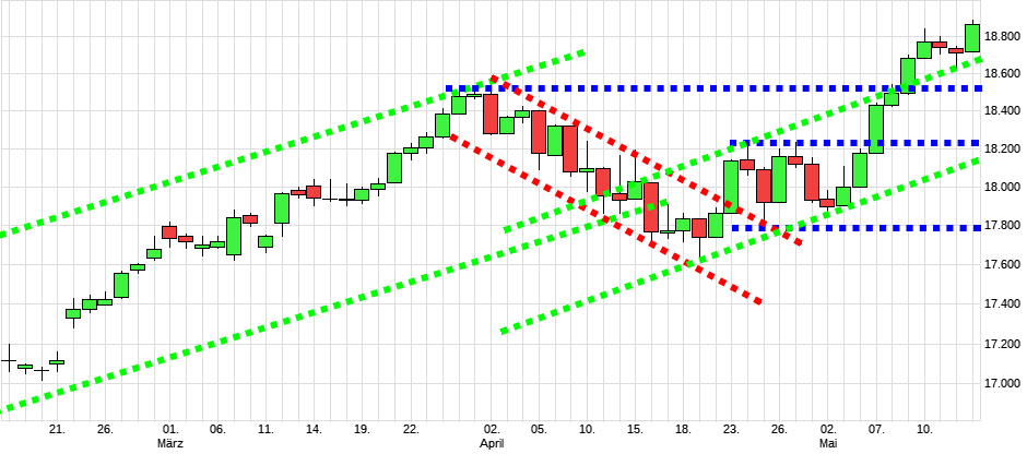 fiel der DAX weitere 100 Puntke. Mit etwas Glück wurden alle rausgedrängt. Ansonsten ist die grüne Trendlinie wichtig.