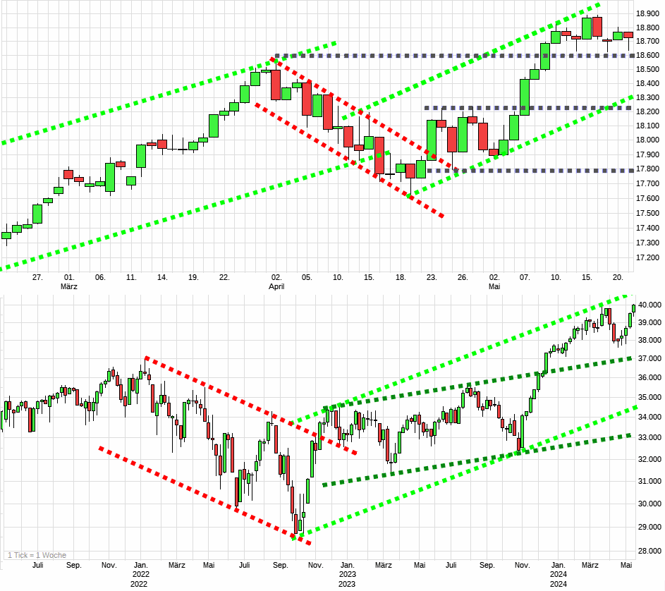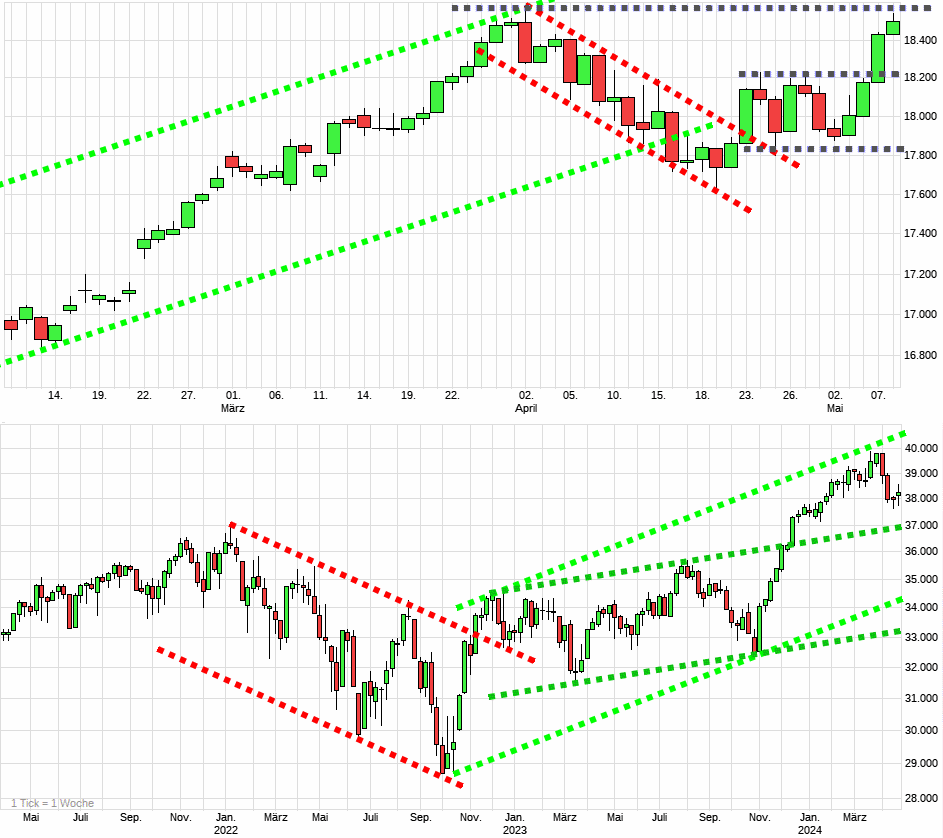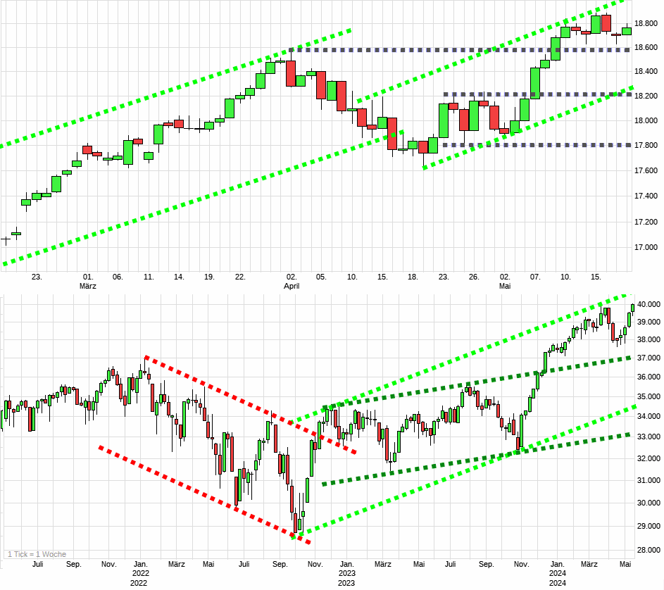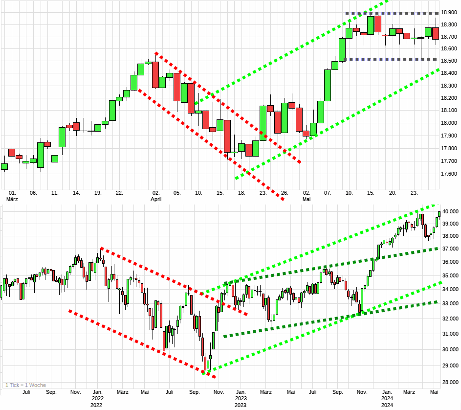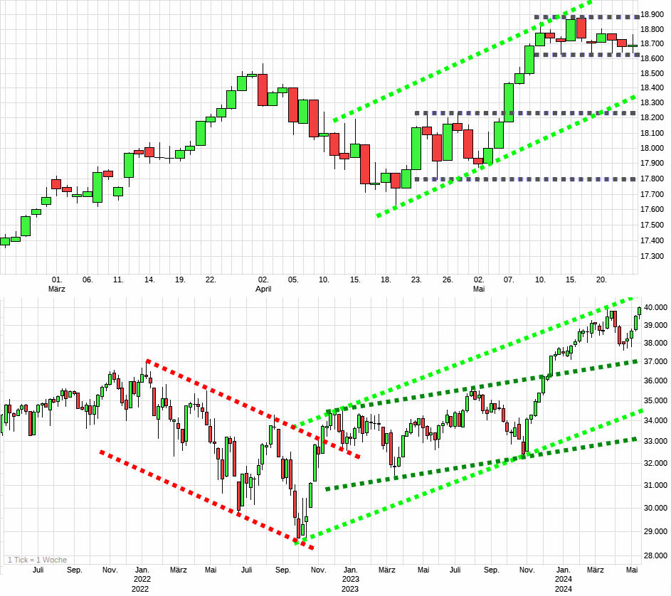 Wäre ein Erreichen der unteren grünen Trendlinie eine Korrektur oder eine normale Bewegung innerhalb eines Trends?