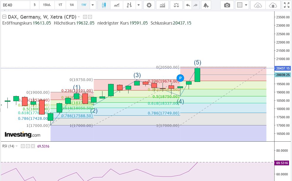 Ich habe mal im Wochenchart etwas herumgemalt. Sähe für mich nach einem sehr sauber abgearbeiteten 5-Weller aus, oder nicht? Ein bisschen Luft wäre demnach noch... Zwischen den Hoch (etwas gerundet) lägen dann immer 750 Punkte. 20500 ist lauf Analysten auch das Basisszenario, auf das gewettet wurde. Nun sieht der RSI aber schon sehr überkauft aus. Der VDax liegt auf 13,xx. Was haltet ihr von der Interpretation? Was sagen die Perlenketten?