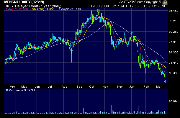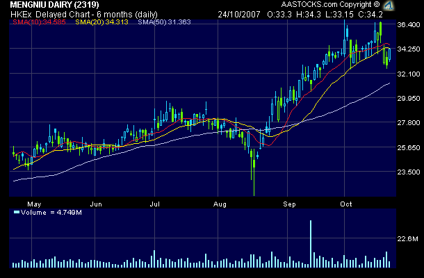 In 3Q07, raw milk price of Mengniu rose 15% yoy due to higher animal feed price. For 1% raw milk price increase, we estimate net profit of Mengniu will drop over 5%. Market worries about sharp earnings decline caused the share price of Mengniu to fall 21% month-to-date.