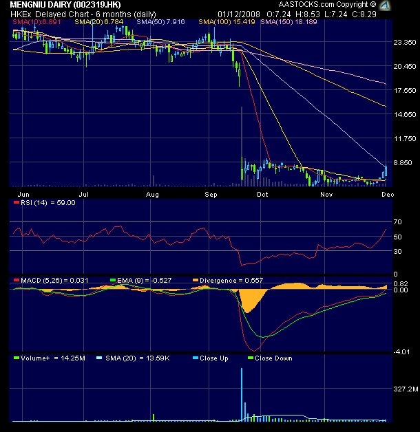 HK heute: 2319 MENGNIU DAIRY 7.96 -12.04 -60.20 3,638,719 449,507