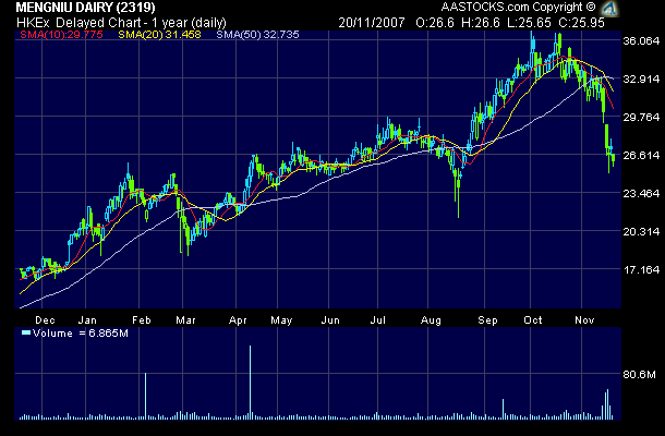 Thinks time to revisit stock is after intended product prices increases implemented, likely in 1Q08. Like yesterday, volume hefty at HK$685 million, though intraday low of HK$26.55 likely solid short-term floor, which off 28% vs all-time high of HK$36.75 hit Oct. 2.
