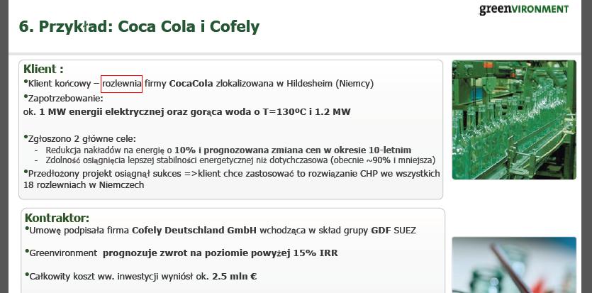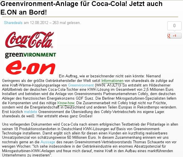 Konkret heißt es hier das sie demnächst kwk Anlagen der Firma Greenvironment einsetzen werden um Ihren Beitrag zum grünen Energiewechsel als großes Industrieunternehmen beizutragen, bzw. bereits einen Auftrag fix erteilt haben für eine Ihrer Abfüllanlagen. Dies ist sehr positiv für Coca Cola anzusehen wird jedoch von Coca Cola in keiner Pressemitteilung erwähnt und ist somit leider nicht als positive Außenwirkung für Coca Cola zu erkennen.
