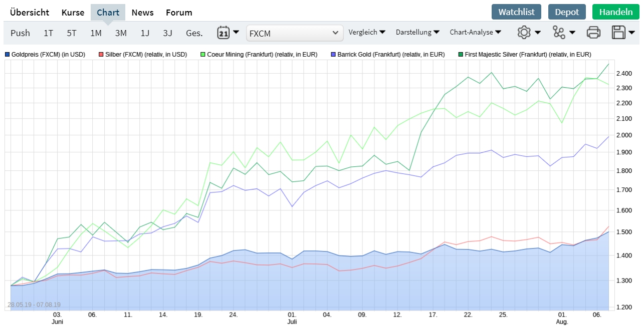 Coeur Mining ist sehr reaktionsfreudig was Edelmetallkurse angeht. Wie man sehen kann hat Coeur Mining aber alles geschlagen was im Chart im Vergleich steht. First Majestic Silber ebenfalls. Solange die Edelmetalle nach oben gehen, geht Coeur Mining auch ab. Gewinnmitnahmen schlagen aber auch schneller und tiefer ein als bei anderen Aktien. Was nicht schlecht sein muss. Zum Einstieg sehr nützlich. Am Ende bleiben die Longtrader und die Zocker kommen nur noch schwer rein ohne den Kurs bis sonstwo zu pushen. Also schauen wir mal ob der Trump es schafft die FED zu größeren Zinssenkungen zu bewegen. Der geht ja offenbar über Leichen. Er wird wohl den Handelskrieg toben lassen um die Märkte zu drücken, bis die Fed und der Rest der Welt sich gezwungen sieht zu tun was er will. Oder er wird abgesägt bzw. irgendwie zum Gegenhandeln gezwungen. Das Szenario muss aber erstmal gebastelt werden. Dazu müssten sich ja auch die Europäer mal zusammentun und gegen die USA schießen... ähm... na klar. Die Europäer zusammentun... wenn es nicht so traurig wäre...