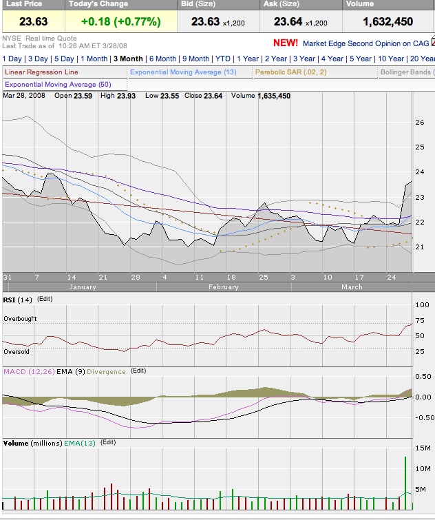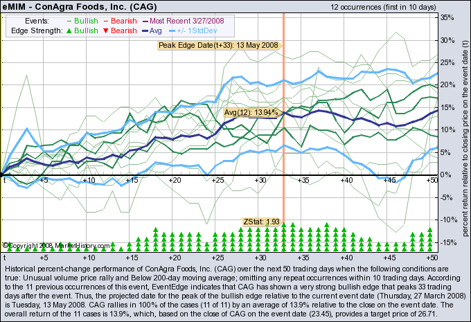 ConAgra Foods (CAG) received a boost from the market on Thursday as Ospraie agreed to a $2.1 billion purchase of the company's commodity trading and distribution business. The news brought the attention of over 8 standard deviations of normal trading volume as the market gained an 'extra big' 7.1% to close at $23.45. Historically the stock has been quite bullish after such a move that continued to trade under the 200-day average.