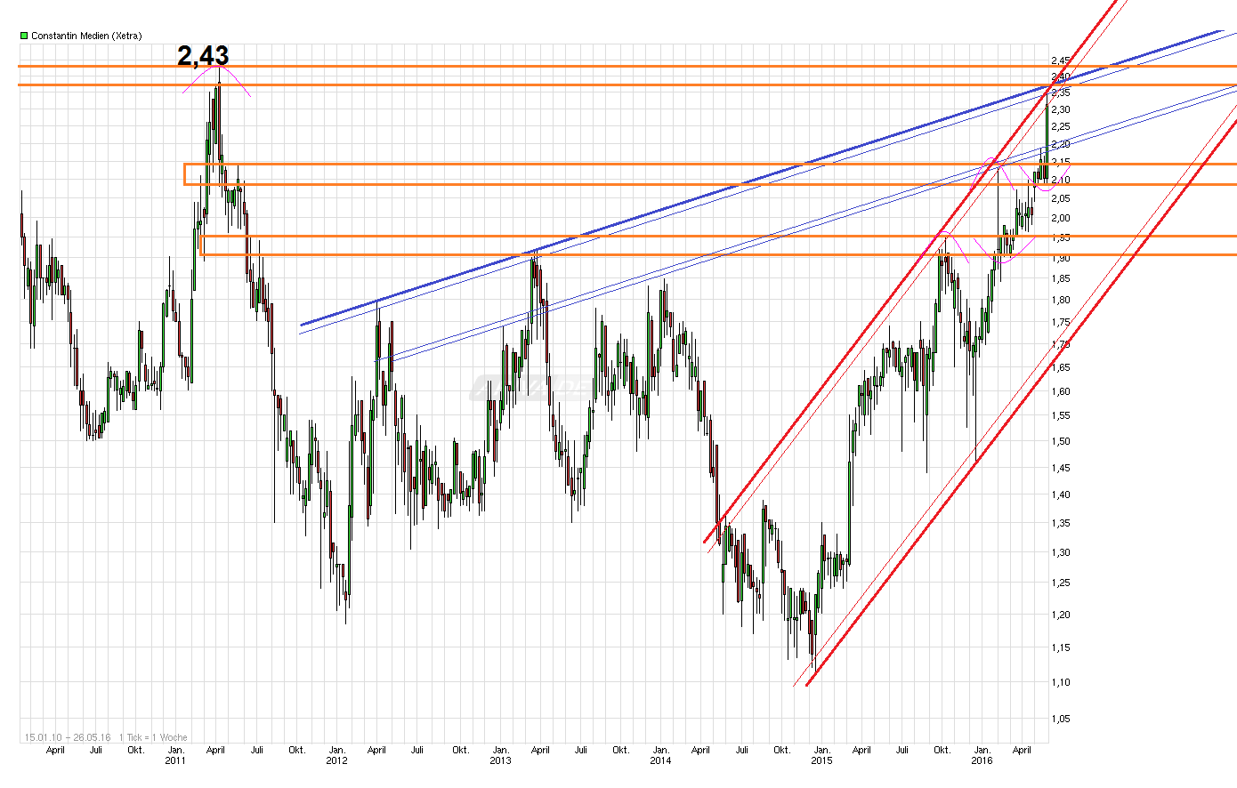 2,40 ist ja weniger das Problem zu erreichen. Da ist man heute auf Xetra schon soweit gewesen. Es geht mir eher darum den alten Widerstand von Anfang 2011 bei ca. 2,43 nachhaltig rauszunehmen und weiter Gas zu geben. Denke da wäre vielleicht erstmal abzuwarten wie das Bietergefecht jetzt weitergeht. Da mischen ja diesmal eine ganze Reihe größerer Player mit die das Ganze teuer werden lassen könnten. Zumindest die Rechte für die Amateuren hätte man jetzt schonmal eingetütet. Keine Ahnung wer sich sowas ernsthaft im TV anschaut, aber solange es sich rechnet für Sport1 soll es einem Recht sein
