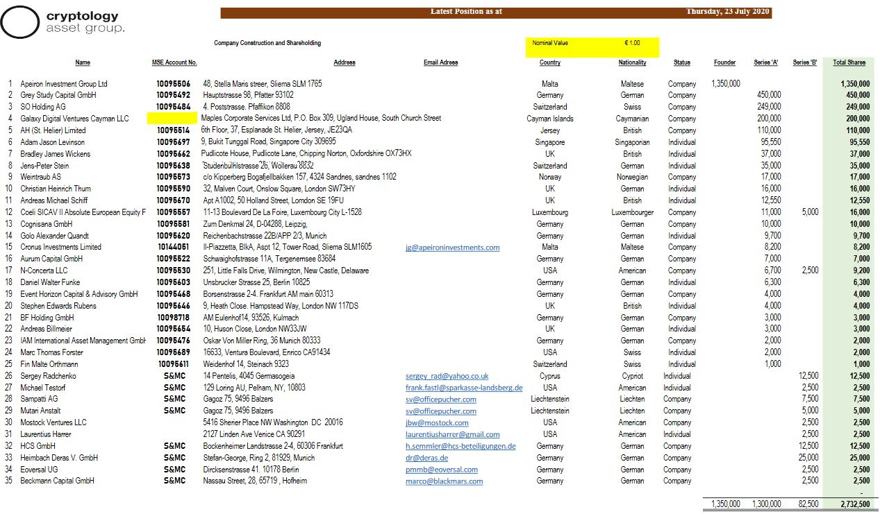 vom 04.08.2020 'Minutes of the Extraordinary General Meeting (EGM) of : Cryptology Asset Group PLC.' unterschrieben von Mr. Jefim Gewiet (Chairman) enthält im Anhang eine Investoren Liste: 'Latest Position as at Thursday, 23 July 2020 Company Construction and Shareholding'.