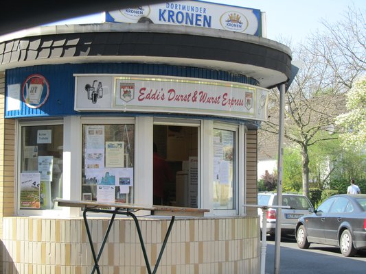 Ambiente: Rundes Büdchen, zwei Stehtische, orangener Mülleimer davor - noch Fragen? Geil!