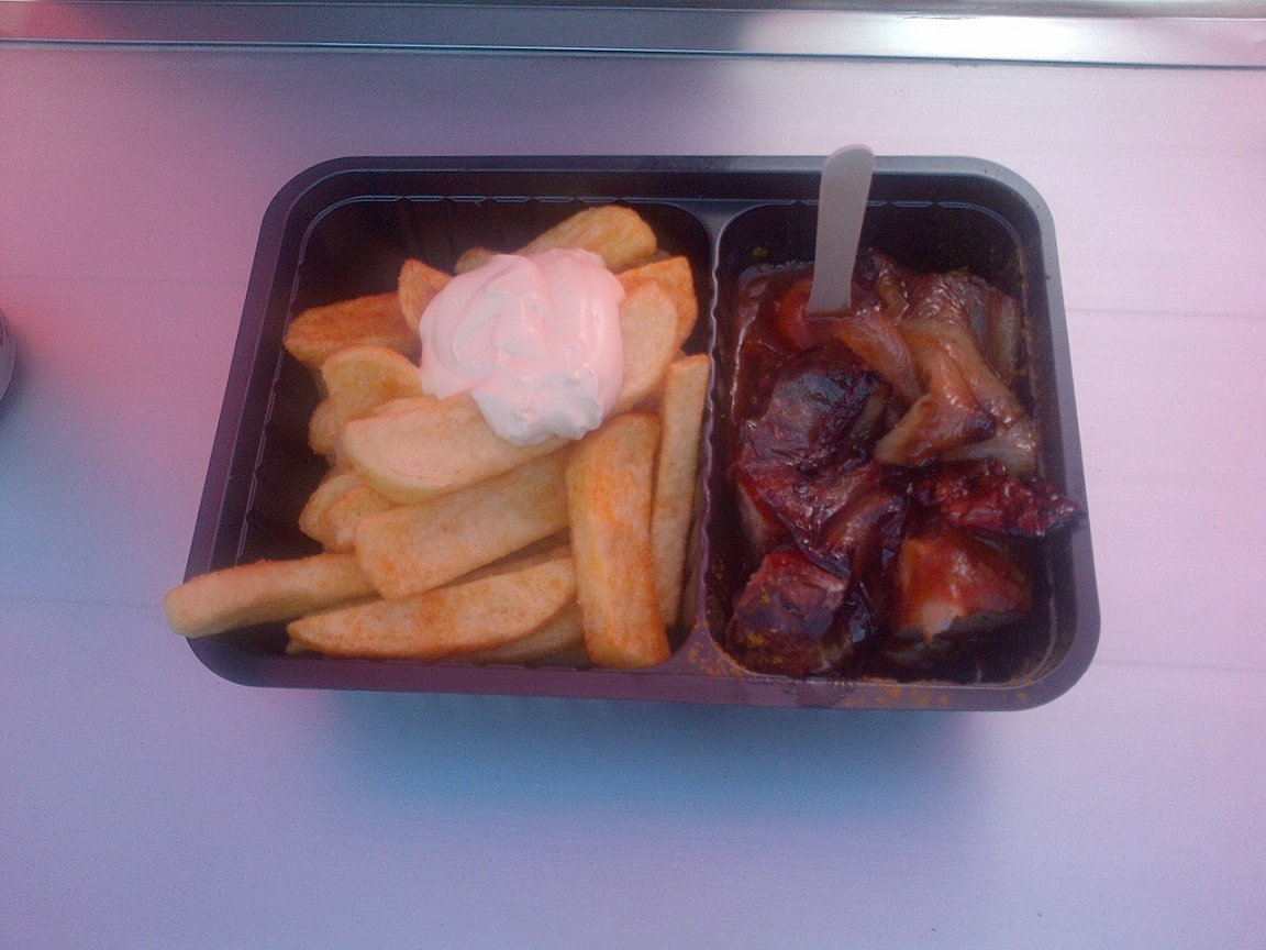 Der Imbiß neben der Brückenschenke in Essen ist son Fall. Aussehen eigentlich hui, aber "Frittenschleuder" ist für das Essen noch ein Kompliment. Unten die Currywurst. In einer häßlichen Plastikschüssel und ertränkt in einer Unmenge an undefinierbarer Soße, in der lapprige halbe Zwiebeln und Paprikas Ihrem endgültigen Ende entgegewesten. Was umso mehr schade ist, als die Wurst selber nicht schlecht war. "Wurstgulasch" wäre die treffendere Bezeichnung für diesen üblen Mampf gewesen.