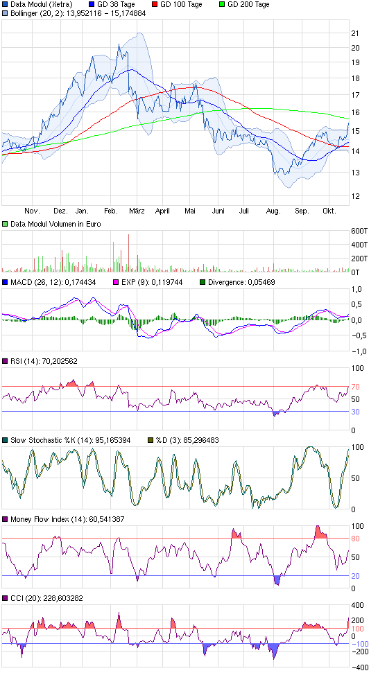 Könnt aber auch sein, dass wir nicht mehr zum Zuge kommen, denn vom Chart her ist eine etwas deutlichere Gegenbewegung durchaus angebracht/realistisch. Nur wenn die 9 Monatszahlen nochmals richtig schlecht werden, könnten wir zu 11,x € nochmal einsteigen. Werd mich dann im November auf die Lauer legen. Bis darin rechne ich grob mit ner Seitwärtsbewegung zwischen 12,5 und 14,5 €.