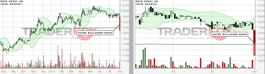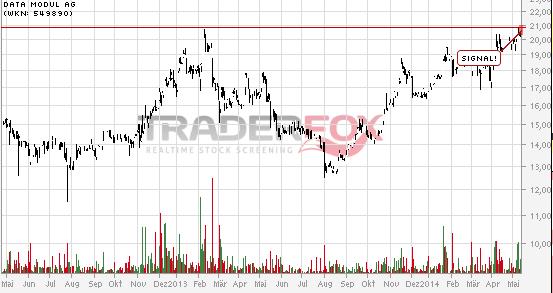 Bereits seit geraumer Zeit zählt die Aktie von Data Modul zum Favoritenkreis von boersengefluester.de. Zu Recht: Mitte Mai schaffte es die Notiz des Herstellers von industriellen Display- und Tochscreen-Lösungen, die Marke von 20 nach oben zu überwinden. Zuletzt setzte jedoch eine deutliche Gegenbewegung bis 17,50 Euro ein – im Markt kursierten Gerüchte um angeblich schlechte Zahlen der Münchner. Den Rest besorgte der schwache Gesamtmarkt. Nun hat Data Modul die Sorgen eindrucksvoll widerlegt. Nach sechs Monaten 2014 kletterten die Erlöse um 9,7 Prozent auf 76,6 Mio. Euro. Das Ergebnis vor Zinsen und Steuern (EBIT) zog von 1,0 auf 4,2 Mio. Euro an. Beim Gewinn je Aktie ergibt sich eine Verbesserung von 0,07 auf 0,83 Euro. Davon stammen allein 0,50 Cent aus dem zweiten Jahresviertel. „Data Modul hat ein über dem Plan liegendes zweites Quartal 2014 gesehen und konnte somit auch ein sehr gutes Ergebnis im ersten Halbjahr 2014 erzielen“, betont die Gesellschaft. Für das Gesamtjahr bleibt die Gesellschaft bei ihrer Prognose, wonach mit einem Umsatzplus von vier bis neun Prozent auf dann 152 bis 160 Mio. Euro zu rechnen sei. Hinsichtlich des Ergebnisses spricht Data Modul von einer „deutlichen“ Verbesserung, ohne konkrete Zahlen zu nennen. Im Geschäftsbericht hatte das Unternehmen eine EBIT-Marge von vier bis sechs Prozent genannt, was auf ein Betriebsergebnis von 6,1 bis 9,6 Mio. Euro hinauslaufen würde. Demnach befindet sich die bereits seit 1989 an der Börse notierte Gesellschaft momentan auf gutem Weg. Der Börsenwert von Data Modul beträgt gerade einmal 64,9 Mio. Euro. Die Investitionen der vergangenen zwei Jahre beginnen sich nun auszuzahlen. Zudem drängt die Firma in neue Branchen wie die Medizintechnik. Mit Sicht auf sechs bis zwölf Monate halten wir Kurse um 25 Euro für erreichbar.
