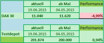 Der DAX verlor seit dem 04.05.2015 immerhin 3,64%, das Testdepot hingegen verzeichnet im gleichen Zeitraum ein Plus von 1,02%.