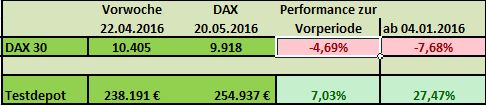 Während der DAX in der vergangenen Woche 4,7% zulegen konnte, blieb das Testdepot mit 0,25% recht bescheiden. Seit Jahresanfang hat das Depot jedoch mit 13,75% gegenüber dem DAX die Nase deutlich vorne.
