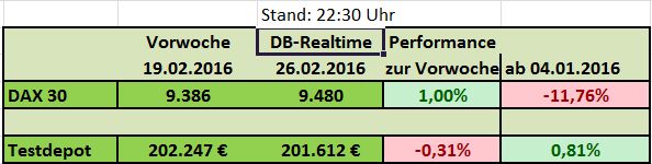 Der DAX schloss am Donnerstag 1,71 Prozent tiefer mit 9851,35 Punkten, im späten Handel mit 9.884 Punkten. Das Testdepot musste seine Vortagesgewinne dem Kursverlauf des Donnerstags opfern. Sowohl die Dax-Wochenperformance mit 0,58% und die Testdepot-Performance mit 0,57% hielten sich die Waage.
