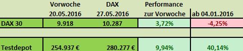 Während der DAX zur Vorwoche 1,67% verlor, legte das Depot um 27,40% zu.
