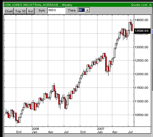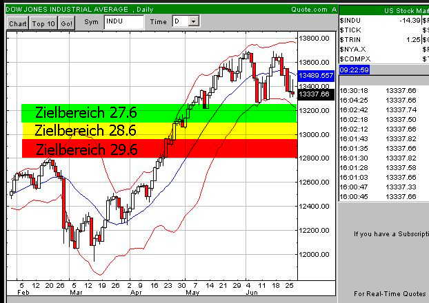 Letzte Woche Freitag gab es ungewöhlich hohe Umsätze bei fallenden US-Märkten. Desweiteren sieht man im Chart ein Doppeltop. Wenn man von einer 50% Korrektur des Anstieges seit der Korrektur Ende Februar ausgeht so müsste der DOW bis ca. 12800 fallen.