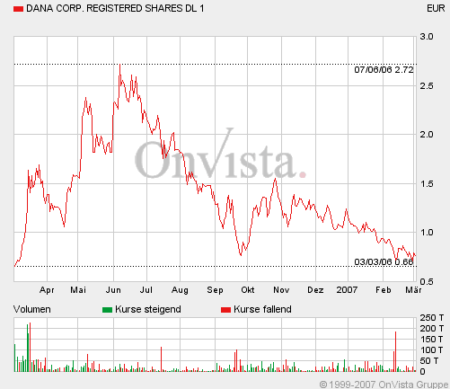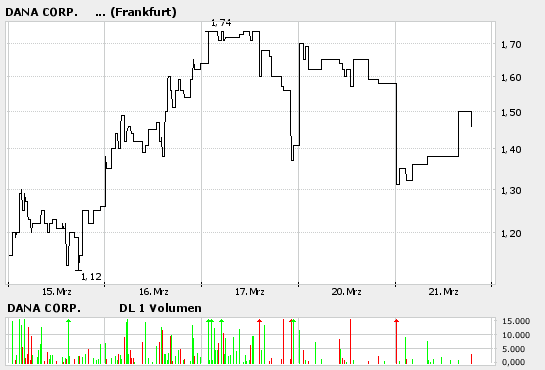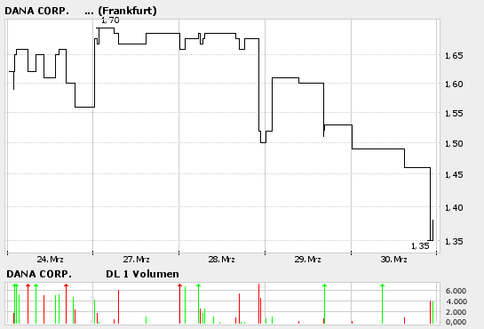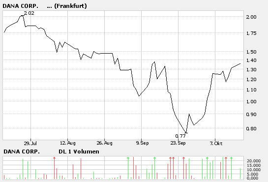 Diese Meldung könne der Aktie allerdings­ kaum noch was anhaben. So habe der Titel in den letzten Monaten schon das schlimmste­ überstande­n. Von Kursen bei rund 14 USD im September 2005 sei es abwärts gegangen bis auf knapp 0,60 USD. Hintergrun­d sei eine stark negative Geschäftse­ntwicklung­, welche schließlic­h dazu geführt habe, dass Dana zahlungsun­fähig geworden sei. Der US-Konzern­ habe daher für sich und seine 40 US-Tochter­gesellscha­ften den Gläubigers­chutz nach Chapter 11 des US-Insolve­nzrechts beantragt.­ Laut Dana sei dabei ein Gemeinschu­ldner-Kred­it in Höhe von 1,45 Mrd. USD vereinbart­ worden, der den Weiterbetr­ieb sicherstel­len solle. Damit würden die zwei Kreditlini­en von 400 Mio. USD bzw. 275 Mio. USD abgelöst.