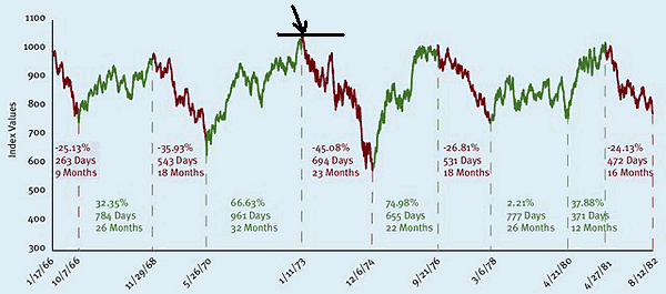 Im Seitwärtsmarkt von 1966 bis 1982 - der sich aktuell auf höherem Level zu wiederholen scheint - verliefen die großen Zyklen nicht in 2-Monats-Abschnitten, sondern eher in solchen von 16 bis 32 Monaten.