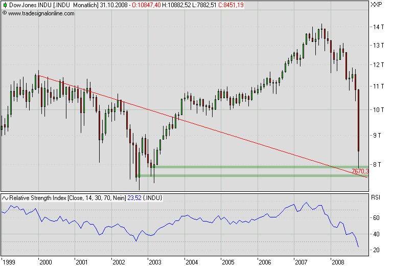 Den exakten Zahlenwert des Dow bei einem Monats-RSI 23,23 hab ich allerding nicht exakt augerechnet sondern nur grob überschlagen da es bei der jetztigen Vola kaum Sinn macht sich an exakte Zahlen zu klammern.