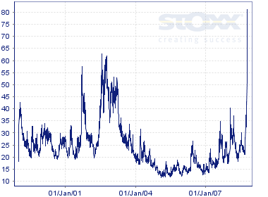 The VSTOXX Index is based on Dow Jones EURO STOXX 50 realtime options prices and is designed to reflect the market expectations of near-term volatility by measuring the square root of the implied variance across all options of a given time to expiration.