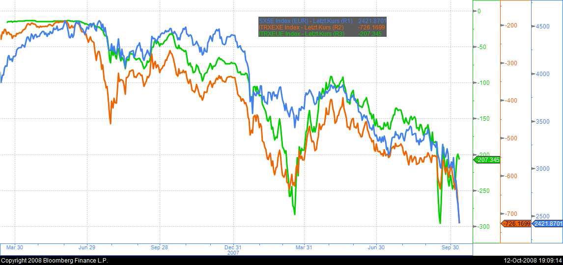 - Die Verspannungen am Kreditmarkt sind lange nicht so schlimm wie gedacht. Dazu der itraxx-Chart der nachrangigen Bankschuldverschreibungen (grün) vs. EuStoxx (blau). Eine solche Divergenz muss aufgelöst werden, vermutlich indem die Aktien wieder stark steigen.